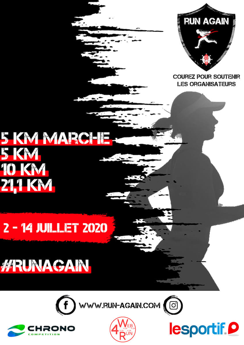 La course RUN AGAIN est constituée de 4 épreuves (5km marche, 5 km, 10 km et 21,1 km) à réaliser en marchant ou en courant dans le lieu de son choix et avant le 14 juillet 2020 à 23h59.